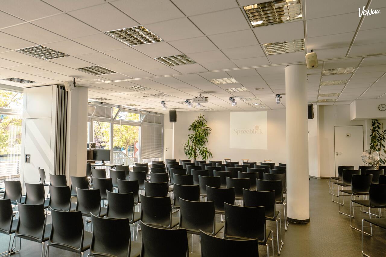 Der Spreeblick Saal ist das Herzstück unseres Hauses – ein 152 m² großer, repräsentativer Raum mit bodentiefen Fenstern, viel Tageslicht und direktem Blick auf die Spree.