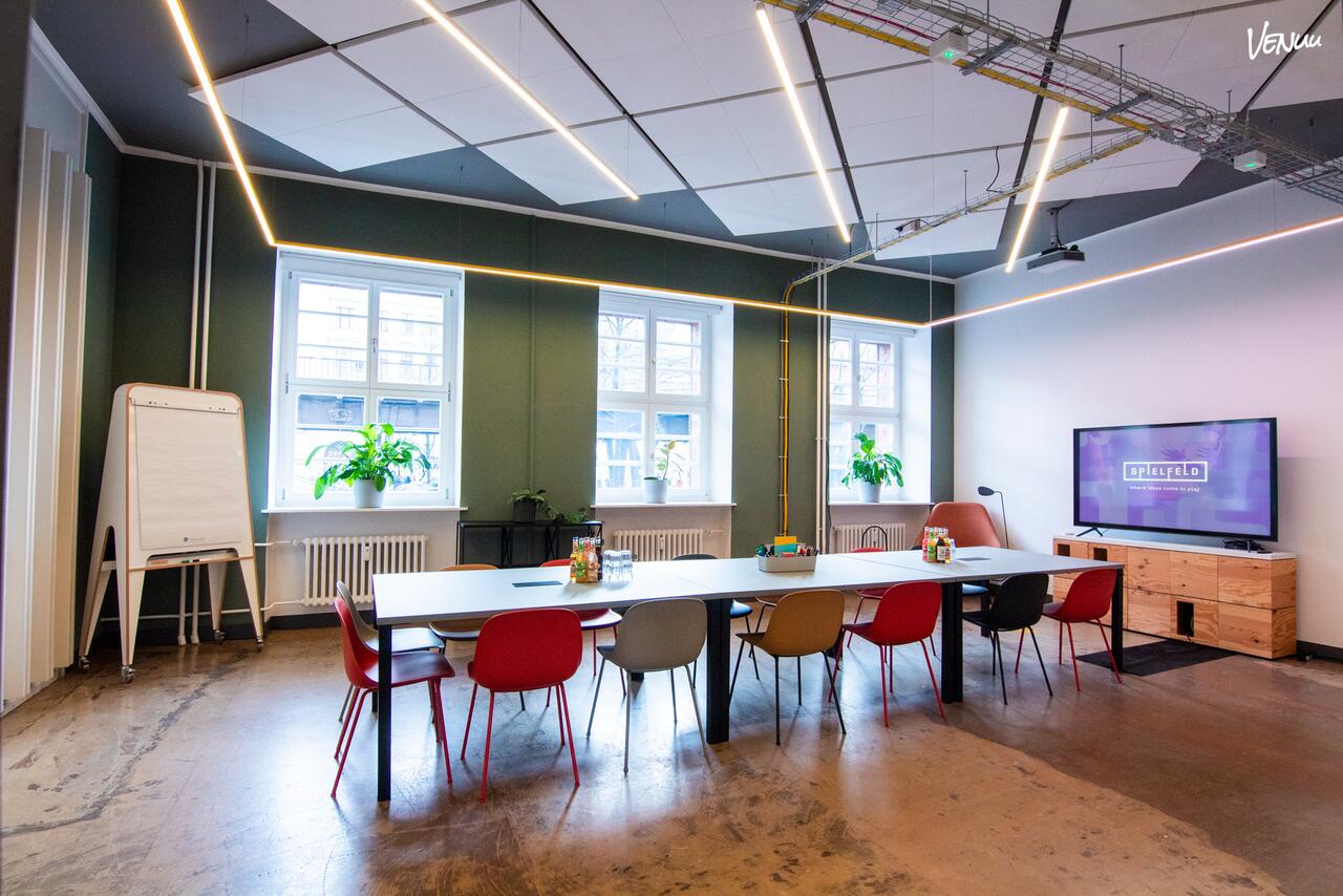 Die Architektur dieses 50 m² großen Raums ist auf maximale Vielseitigkeit und Barrierefreiheit ausgelegt. Dank der rollstuhlgerechten Gestaltung und der großzügigen Fläche finden hier bis zu 25 Personen Platz, um gemeinsam neue Ideen zu entwickeln. Die Ausstattung lässt keine Wünsche offen: Ein leistungsstarker Projektor, hochwertige Lautsprecher sowie ein komplettes Set an Moderationstools – von Whiteboards und Pinnwänden bis hin zu speziellen Workshop-Möbeln – stehen bereit. Für hybride Szenarien sorgt modernste Videokonferenztechnik auf Anfrage für eine reibungslose Kommunikation mit externen Teilnehmern.