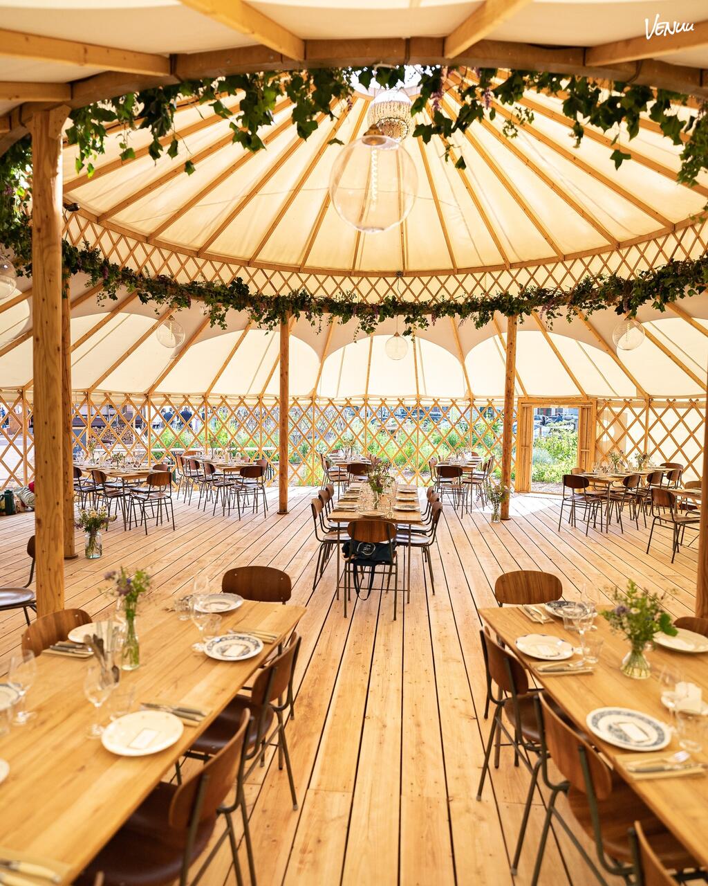 Der er plads til 100 siddende og 120 stående i den store yurt. Yurten har sin egen "baghave" for velkomstdrink, ceremonier eller blot til at nyde haven.