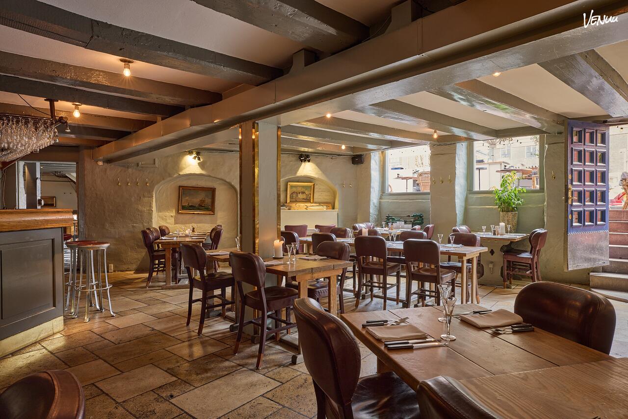 At holde et selskab i stueetagen af "Øresund" på Nyhavns Færgekro er en oplevelse, der bringer jeres gæster helt tæt på den autentiske havnestemning. Lokalet "Nede" er præget af de historiske pakhusrammer med hvide fliser, varme trædetaljer og det karakteristiske maritime interiør, der har gjort kroen til en institution i Nyhavn. Her er atmosfæren uformel, hyggelig og fyldt med sjæl, hvilket skaber en tryg ramme om alt fra intime familiefester til hyggelige firmafrokoster midt i Københavns hjerte.
