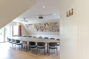 Mødelokale 1 hos Hotel Faber er et mindre, stilfuldt lokale med plads til ca. 6-8 personer. Lokalet tilbyder komfortable rammer til møder, interviews eller private samtaler, med AV-udstyr og Wi-Fi.