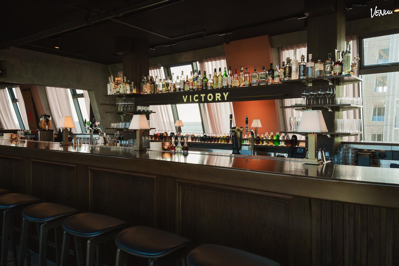 På ottende sal af 25hours Hotel Papirøen, højt over byen, finder du en livlig cocktailbar med panoramaudsigt, der øjeblikkeligt sætter tonen for festlighederne.