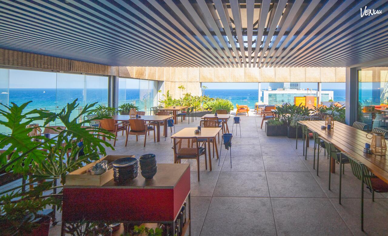 - Terraza con vistas panorámicas: Disfruta de una experiencia única con vistas 360º de Barcelona, que incluyen el puerto, la playa de la Barceloneta y Montjuic. La terraza está parcialmente cubierta y acondicionada para todas las estaciones, lo que la convierte en un lugar versátil durante todo el año. Además, cuenta con dos salones privados exteriores con vistas al puerto y Montjuic, perfectos para crear un ambiente íntimo.