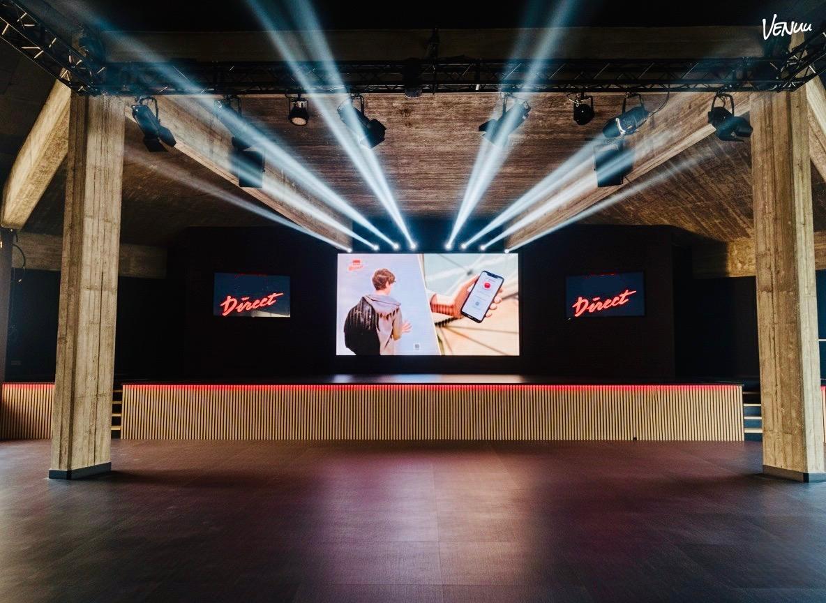 Además, el espacio permite introducir vehículos en su interior, convirtiéndose en la opción ideal para presentaciones del sector automoción o eventos de alto impacto visual. Dispone de una pantalla LED gigante de 12,5 m², perfecta para proyecciones, branding corporativo o contenidos audiovisuales, complementada con 5 pantallas adicionales para cartelería digital dinámica.