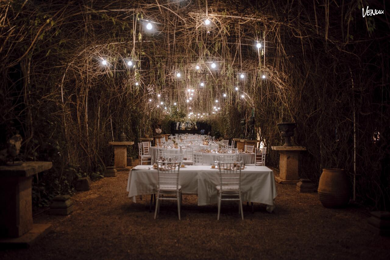 Con capacidad para acoger celebraciones íntimas o banquetes más amplios, la Pérgola ofrece un entorno fresco, natural y lleno de encanto. Su atmósfera orgánica convierte cada entrada nupcial en un momento inolvidable y cada cena en una escena etérea entre luces, naturaleza y arte.