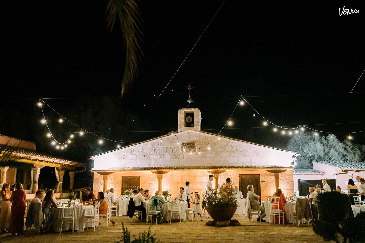 Al caer la tarde, la plaza se transforma. Las guirnaldas de luces suspendidas (con coste adicional), la calidez de la capilla iluminada y las palmeras que enmarcan el cielo crean una atmósfera íntima, elegante y profundamente romántica. Es un espacio perfecto para organizar cenas bajo las estrellas, discursos, bailes y cualquier celebración que busque un entorno mágico y auténtico.