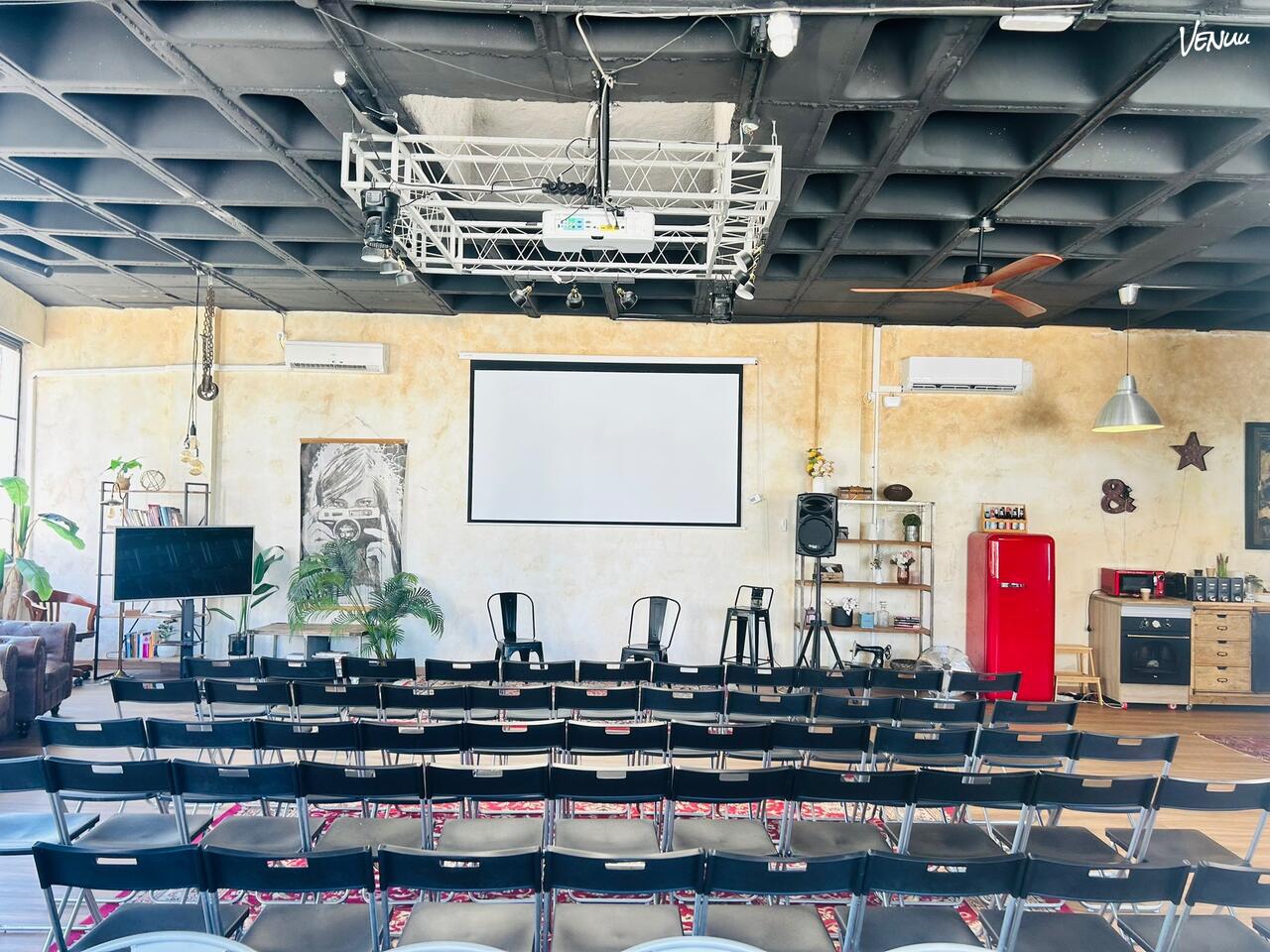 Si buscas alquiler de sala para presentaciones en Madrid, nuestro loft permite montaje en formato teatro con sillas incluidas, configuración tipo cóctel, escuela o showroom.