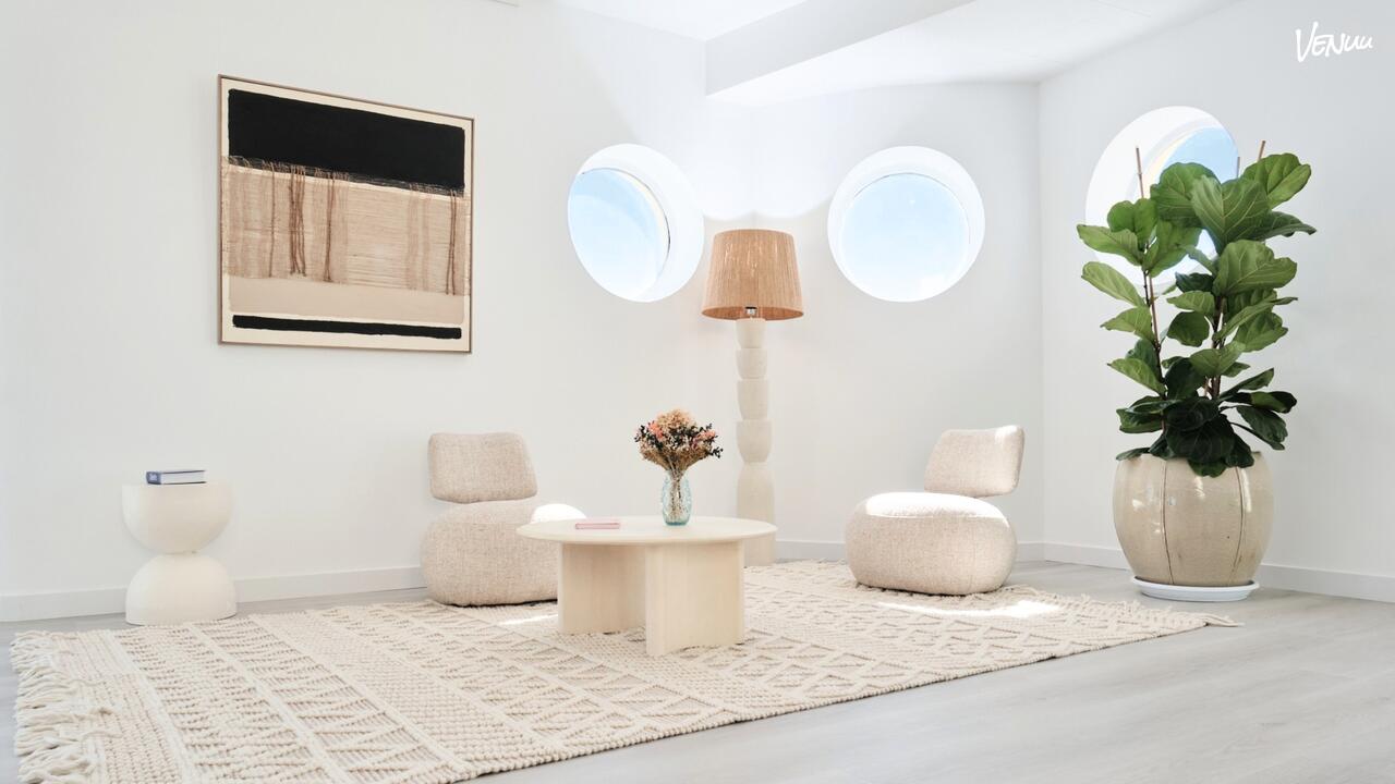 La sala cuenta con 138 metros cuadrados distribuidos en diferentes ambientes y se distingue por sus amplios y característicos ventanales que ofrecen unas vistas de 360 grados de la capital. Sus paredes blancas reflejan la luz natural, una luz que hace de él uno de los áticos más especiales de Madrid.