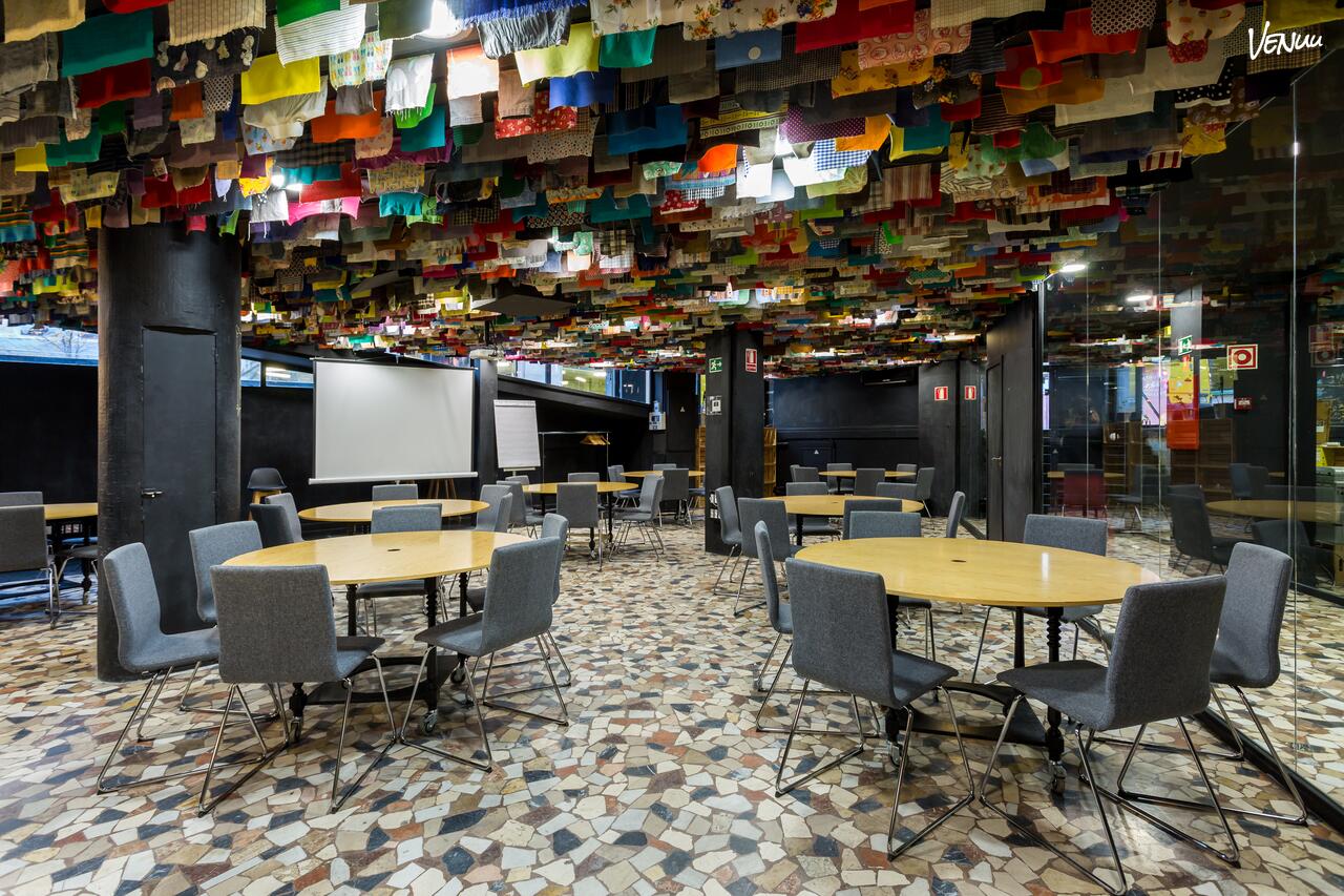 La Sala Atenas es un espacio que desafía lo convencional, diseñado para eventos que buscan dejar una huella memorable. Su característica más distintiva es el techo vibrante, una obra de arte suspendida formada por un colorido y denso patchwork de telas, que contrasta audazmente con las columnas y paredes oscuras. Esta estética única se asienta sobre un suelo de mosaico tradicional, creando un ambiente inmersivo y altamente inspirador para el brainstorming y la innovación.