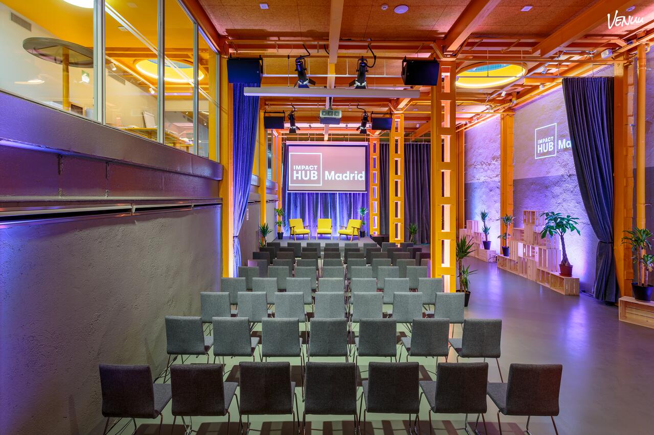 La Sala Europa de Impact Hub Madrid se presenta como la solución premium para la celebración de eventos de tipo corporativo. Este espacio ha sido concebido para el máximo impacto, ofreciendo un amplio aforo en formato teatro que combina gradas y sillas, e incluye una tarima de obra. Es el entorno ideal para conferencias, presentaciones y foros que demandan solemnidad y profesionalidad, garantizando una excelente visibilidad para todos los asistentes.