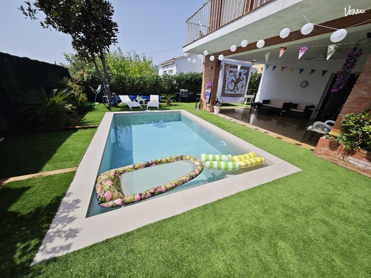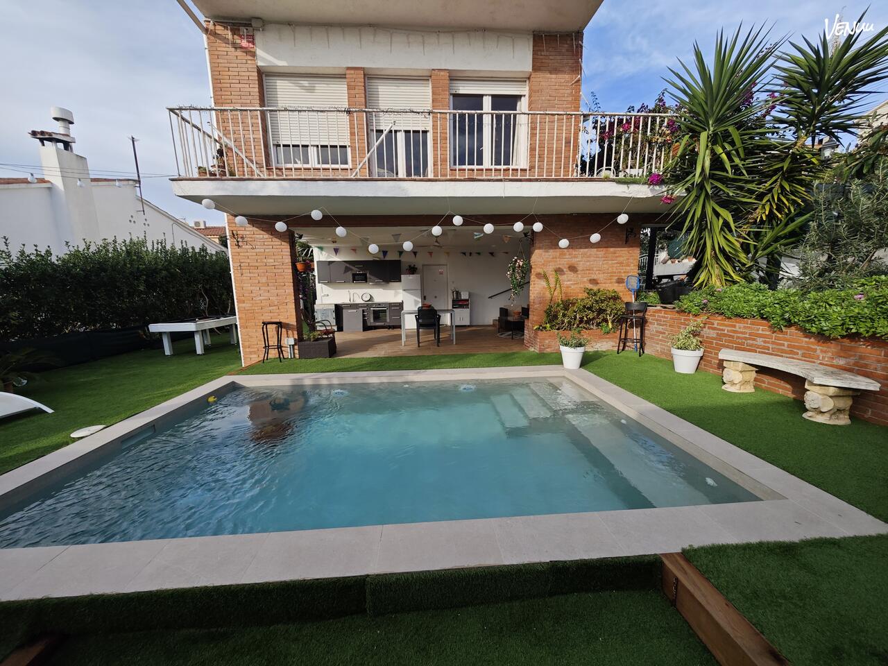 El corazón de este jardín es su magnífica piscina, perfecta para refrescarse y disfrutar, complementada por una zona de barbacoa de obra lista para sus comidas y celebraciones. La comodidad está garantizada con amplias mesas y sillas dispuestas bajo una hermosa pérgola, creando un rincón sombreado para el banquete. Además, el porche cubierto ofrece un fantástico espacio chillout donde la diversión continúa con entretenimiento como billar y ping-pong, asegurando que haya una zona de juegos y ocio para todas las edades.