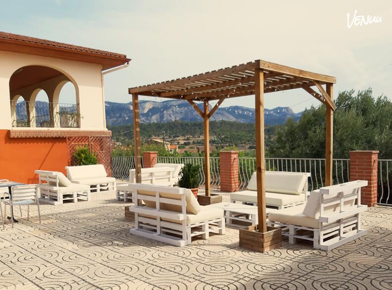 La terraza está situada en la primera planta de la masía. Se puede contratar desde servicio básico de bar hasta coctelería acrobática.