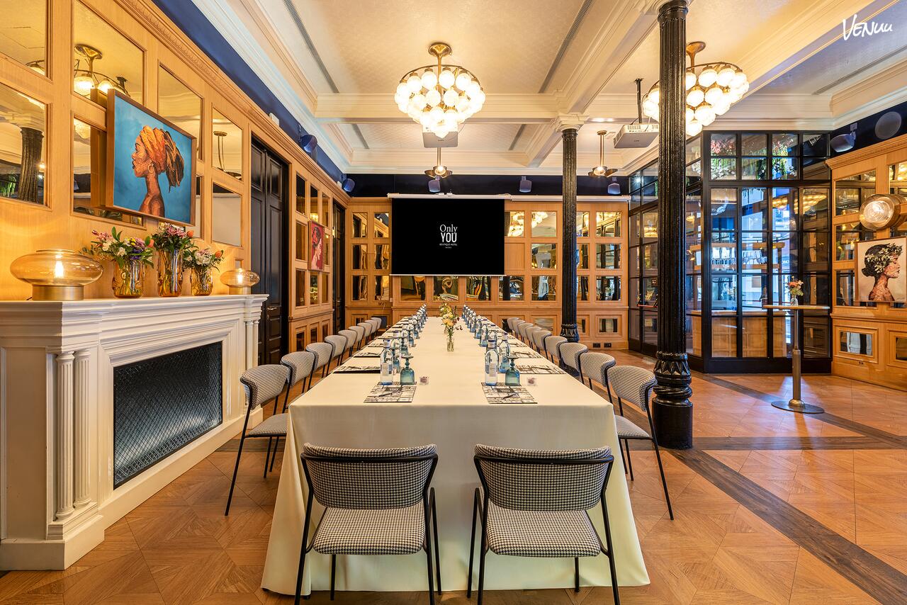 Con 80m2 es nuestro espacio más versátil adaptándose a múltiples tipos de montaje y su decoración lo llena de encanto. Tiene vistas a la calle Augusto Figueroa a través de su cristalera lateral; además de una puerta con acceso directo a la calle. Está acondicionada con 2 proyectores y dos pantallas.