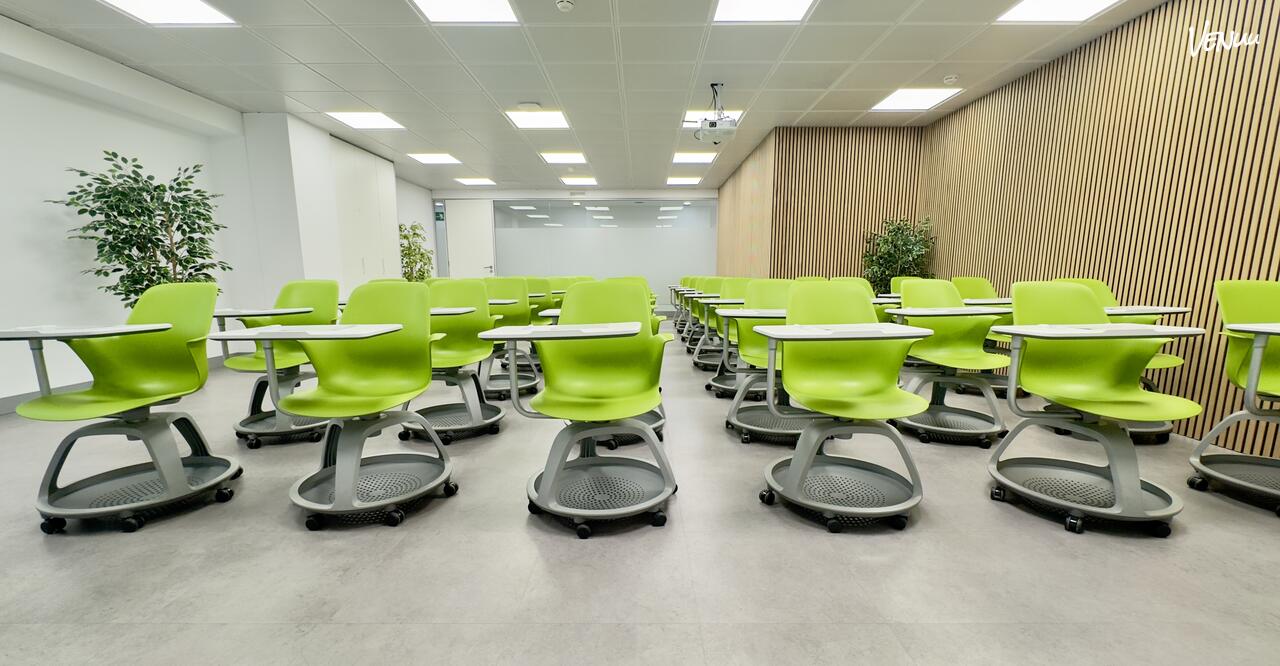 Sala de 71 m2 útiles, con capacidad para hasta 76 personas (la capacidad de la sala va a depender siempre del montaje que se solicite: U, teatro, imperial, escuela, etc.). Equipada con proyector, pantalla, pizarra, wifi, etc.