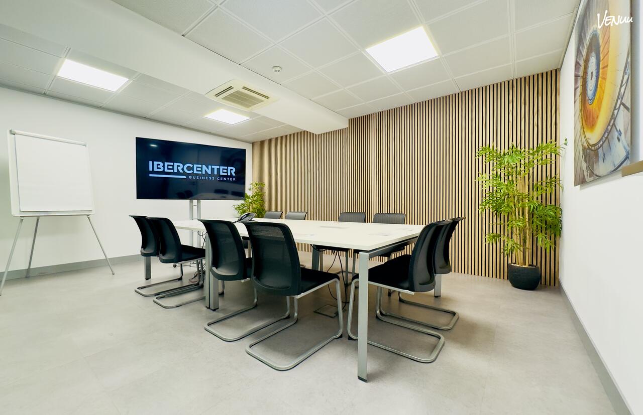 Sala de reuniones de 24 m2 útiles, con capacidad máxima para 12 personas. Que incluye en su precio el uso de TV o proyector, pizarra, conexión a internet, agua, cuadernillos y bolígrafos de bienvenida.