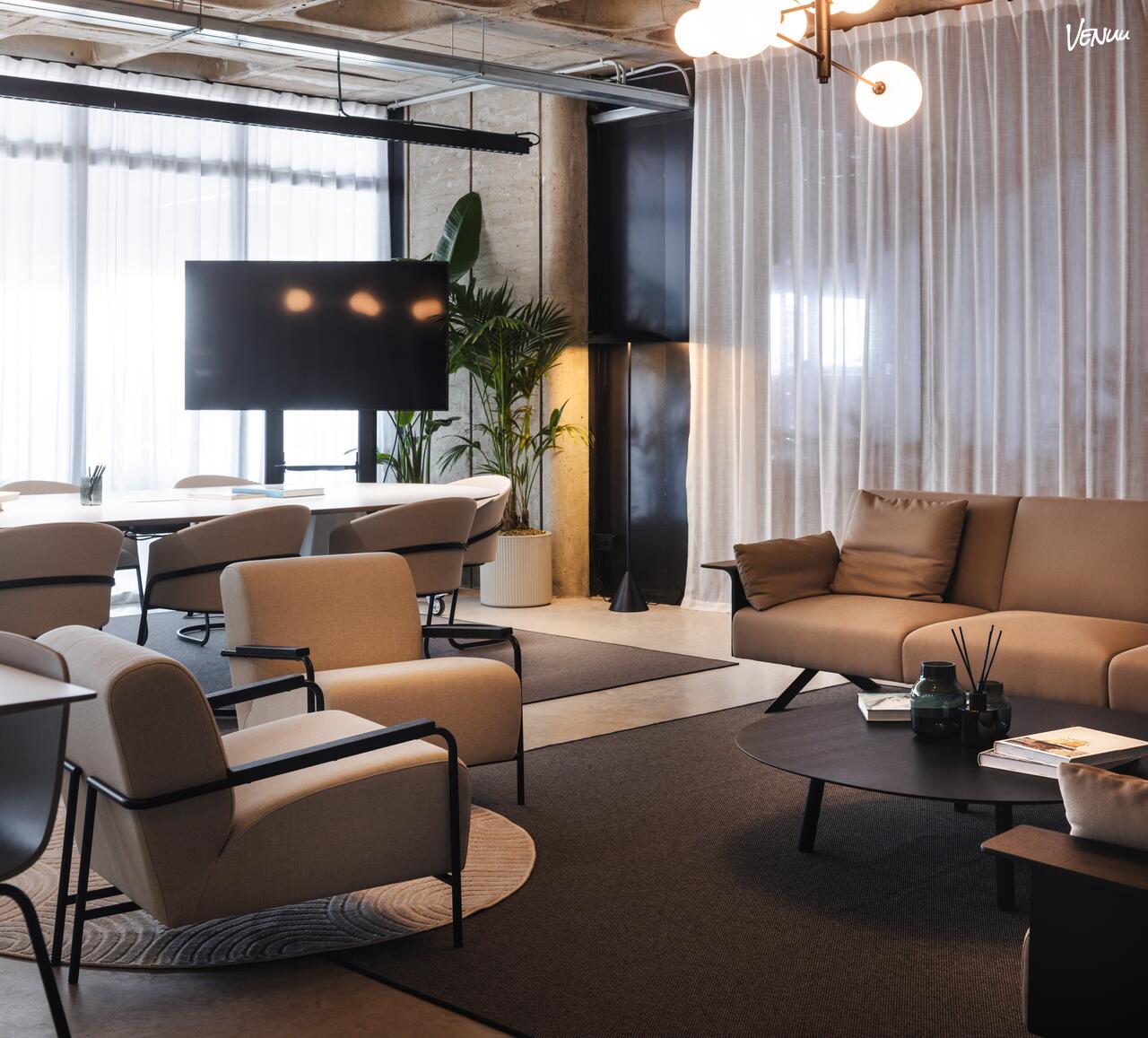 The Terminal Hub - Lounge es una sofisticada sala de juntas situada en la Planta 0, diseñada para ofrecer un entorno de máxima privacidad y confort para encuentros corporativos de alto nivel. Con una superficie de 80 m², este espacio destaca por su versatilidad, permitiendo desde reuniones ejecutivas formales hasta almuerzos privados del restaurante en un ambiente exclusivo. Su diseño combina una estética industrial con mobiliario premium, creando una atmósfera profesional y acogedora inundada de luz natural.