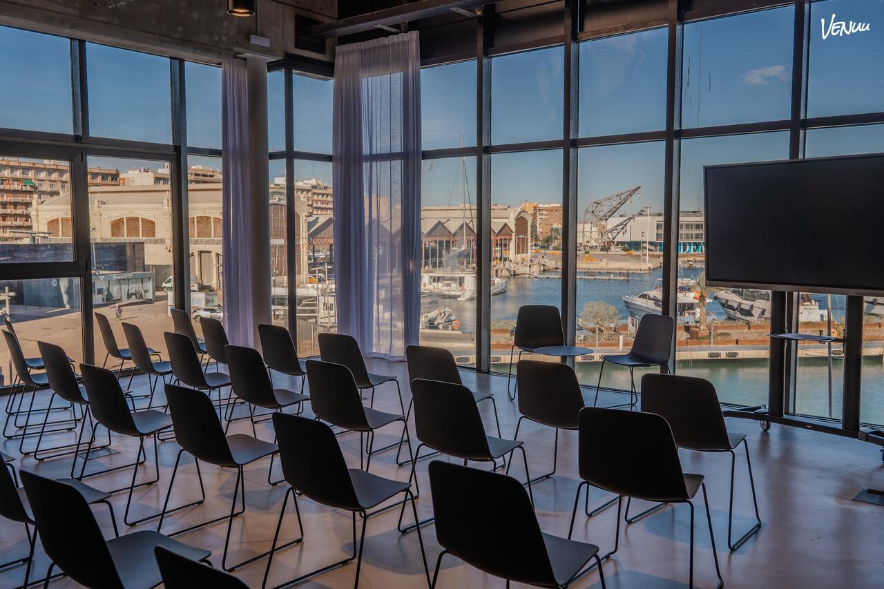La Sala Torres es un espacio polivalente de 50 m² situado en la segunda planta del edificio, diseñado para ofrecer un entorno corporativo moderno con vistas inigualables al puerto de Valencia. Con una capacidad para 35 personas en montaje tipo teatro, esta sala destaca por su arquitectura industrial de hormigón visto y su excepcional luminosidad natural. Es el lugar idóneo para presentaciones de producto, conferencias y reuniones de trabajo que busquen una identidad singular y profesional.