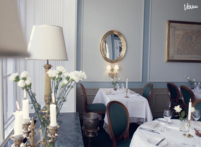 Vi har plads til 30 personer ved et langt bord i restauranten.