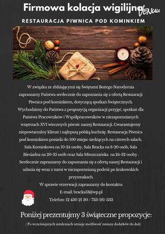"W związku ze zbliżającymi się Świętami Bożego Narodzenia zapraszamy Państwa serdecznie do zapoznania się z ofertą Restauracji Piwnica pod kominkiem, dotyczącą spotkań Świątecznych. Wychodzimy do Państwa z propozycją organizacji przyjęć, spotkań dla Państwa Pracowników i Współpracowników w niezapomnianych wnętrzach XVI wiecznych piwnic naszej Restauracji.