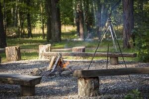 Przestrzeń eventowo-campingowa w leśnym klimacie. Zorganizujesz tu wszelkiego rodzaju imprezy urodzinowe z atrakcjami.