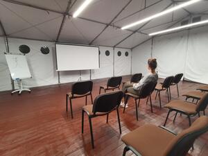 W pełni wyposażony namiot w plenerze, o powieżchni 80m2 świetnie sprawdzi się jako ciekawa alternatywa typowej sali na organizację szkolenia w Krakowie.
