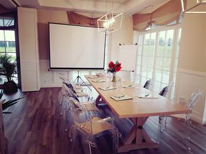 Jasna sala przeznaczona na konferencje. Miejsce z dużą ilością przestrzeni zapewni komfortowe warunki spotkania biznesowego w eleganckim stylu.