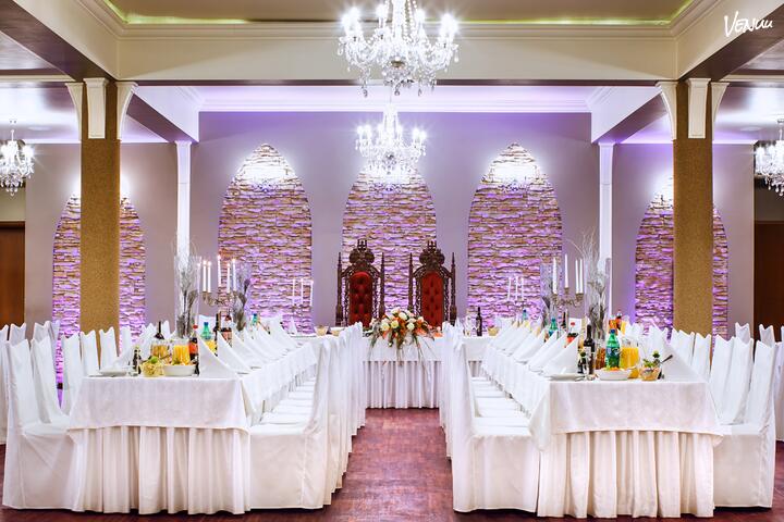 Sala Kryształowa to iście królewski wybór na organizację wesela w Dworze Artusa. Salę wynajmujemy na wyłączność - podczas wesela, w budynku nie odbywają się inne uroczystości. Jesteśmy gotowi kompleksowo zająć się oprawą wesela. Posiadamy własną kuchnię oraz proponujemy weselne menu, które wedle życzenia możemy poddać modyfikacji. Szczególnie zależy nam na komforcie Młodej Pary i ich gości - spełniamy Wasze oczekiwania i dzielimy się doświadczeniem w organizacji dużych imprez. Na Państwa Młodych czeka własny apartament oraz dodatkowy pokój dla Rodziny.