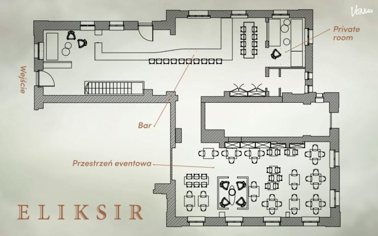 Eliksir specjalizuje się w organizacji wyjątkowych eventów i wydarzeń z naciskiem na dbałość o detale - od profesjonalnej obsługi poczynając, po eleganckie wnętrza a na wyśmienitym menu kończąc. Przestrzeń eventowa we wnętrzach Eliksiru oferuje miejsce dla 80 osób i idealne nadaj się do organizacji konferencji, spotkań biznesowych, firmowych wigilii a także uroczystości rodzinnych jak chrzciny, komunie czy wesela.