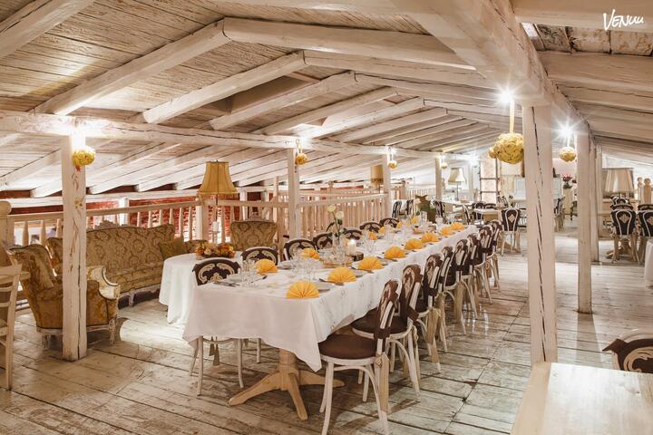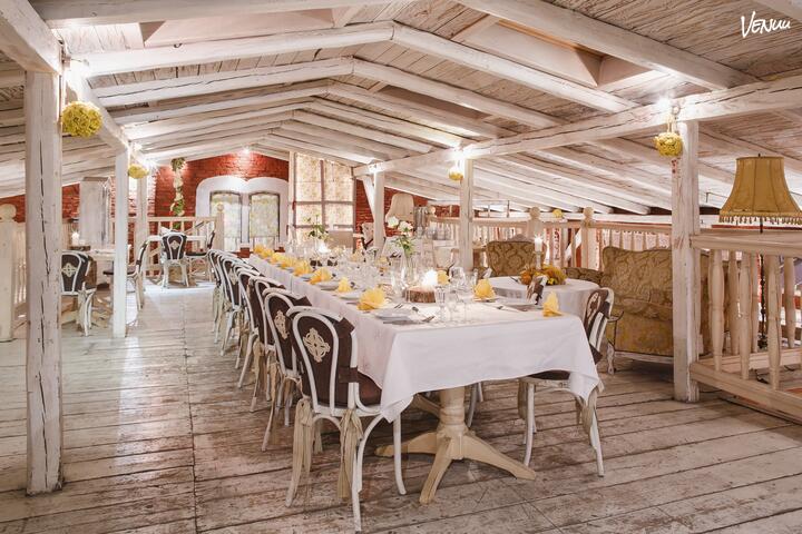 Sala kameralna usytuowana na poddaszu, świetnie nada się do organizacji przyjęć okolicznościowych typu urodziny, komunie itp.