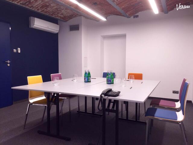 Sala Niebieska to najmniejsza przestrzeń w naszej ofercie. W ustawieniu teatralnym pomieści 15 osób.