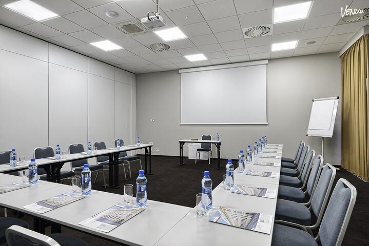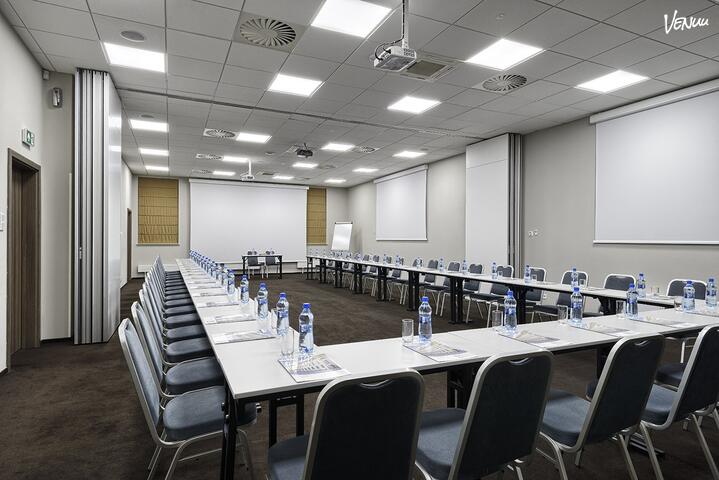 Sala Złota to nasza największa sala konferencyjna. Wyposażona jest w nagłośnienie, projektor, ekran oraz flipchart. W ustawieniu teatralnym pomieści do 130 osób.