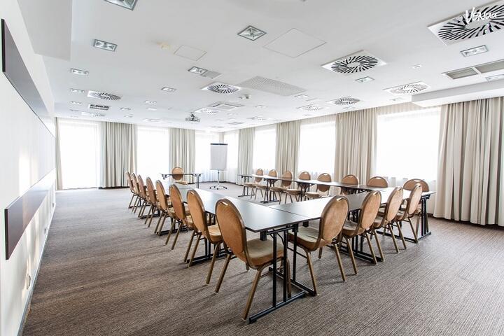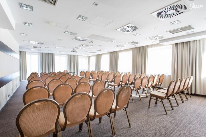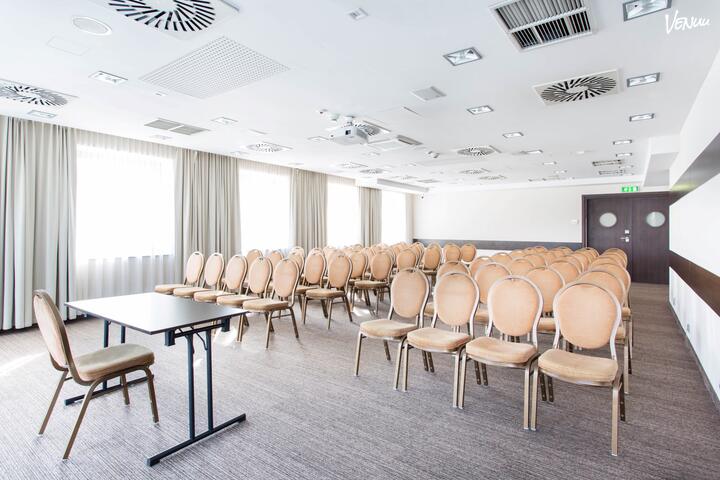 Sala B to klimatyzowana, modułowa sala konferencyjna która pomieści do 105 osób w ustawieniu teatralnym. Sala posiada pełne wyposażenie konferencyjne.