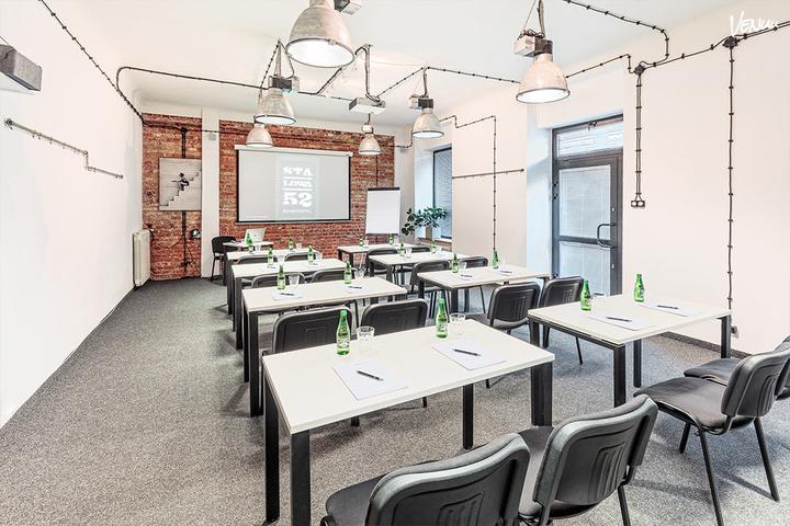 Sala Akademia to sala konferencyjna przeznaczona dla grup do 50 osób, która stanowić będzie doskonałe tło dla warsztatów, szkoleń, spotkań biznesowych czy konferencji. Wystrój wnętrza i połączenie białych ścian z czerwoną, odsłoniętą cegłą nadają tej sali konferencyjnej wyjątkowy charakter.