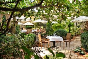 Pełen zieleni ogród restauracji Trattoria, który pozwoli zorganizować idealne przyjęcie komunijne w eleganckim stylu na krakowskim Starym Mieście.